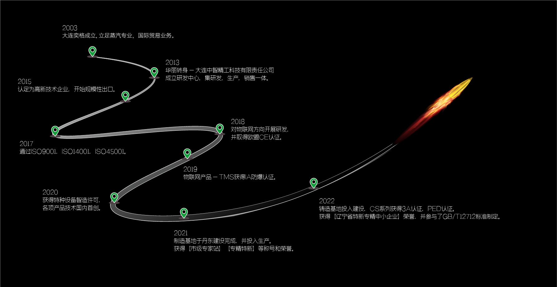 =中智精工(Sino-Tech)始于2003年,集自主研发、先进制造、高端设计、精准销售为一体的高科技企业,专注于蒸汽应用技术研究、专心于蒸汽节能产品制造、专业于蒸汽系统智能监测。拥有自主知识产权50余项,参与GB/T12712编制,获得CE认证、3A认证、ISO9001/14001/45001认证、TS特种设备生产许可、PED 、Ex ia防爆认证等资质。公司作为高新技术企业、市专家工作站,与大连理工大学、大连海事大学、大连东软信息学院、大连海洋大学等多所高校深度合作;产品和技术广泛应用于石化、医药、食品、烟草、轮胎等行业。